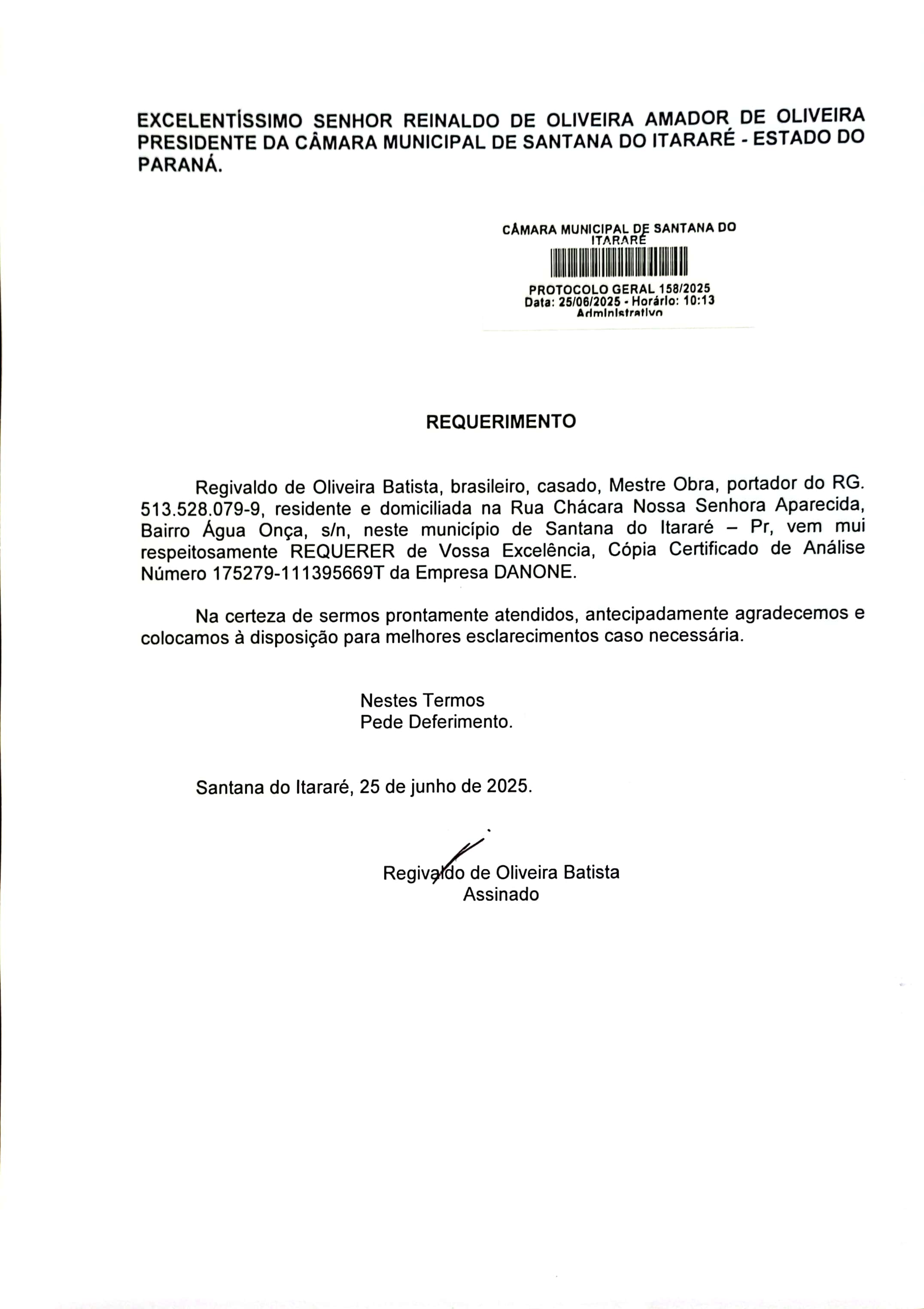 | REQ Nº 036/2025 - REQUERIMENTO Interessado: REINALDO DE OLIVEIRA AMADOR OLIVEIRA Assunto: Cópia Certificado de Análise Número 175279-111395669T da Epresa DANONE. Protocolo: 158/2025 Texto Integral |